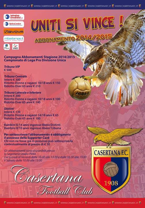 Ecco la locandina ufficiale della Casertana della campagna abbonamenti valida per la stagione 2014-15 . Ecco tutti i prezzi :