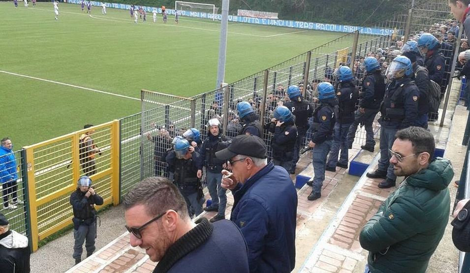Come detto, tale increscioso e vigliacco gesto è soltanto la punta dell’iceberg, il finale di un film cominciato molto prima. Dal settore dei tifosi di casa, durante l’intero arco del match c’è stato un ripetuto lancio di sputi e oggetti (bottigliette e mazze) nei confronti del settore ospiti. Ci piace pensare che se Darwin fosse stato presente a Bacoli quest’oggi si sarebbe ricreduto sulla “Teoria dell’evoluzione”. E se il comportamento di chi era sugli spalti non è stato per nulla encomiabile, giusto per usare un eufemismo, dobbiamo purtroppo sottolineare che non lo è stato nemmeno quello di alcuni tesserati della squadra di casa che, in particolar modo in occasione del 2-0, si sono resi protagonisti di gesti volgari e di sbeffeggi di ogni tipo verso il settore occupato dai sostenitori viola, nonché del lancio di un pallone che ha colpito un esponente delle forze dell’ordine presente nel settore ospiti. Forse volendo forzatamente cercare un perché a quanto accaduto oggi sugli spalti, in campo e nel parcheggio dell’impianto bacolese, basta far riferimento all’espulsione del mister di casa per comportamento antisportivo avvenuta ancor prima che l’arbitro fischiasse l’inizio del match…