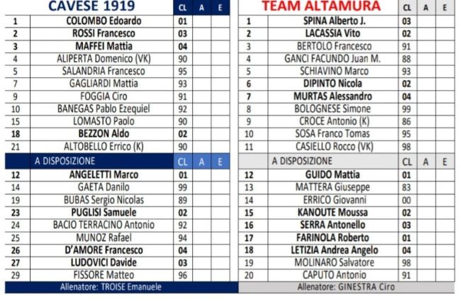 Cavese in maglietta e pantaloncini blufoncé con calzettoni bianchi; Altamura in maglia bianca con striscia diagonale rossa, pantaloncini bianchi e calzettoni rossi