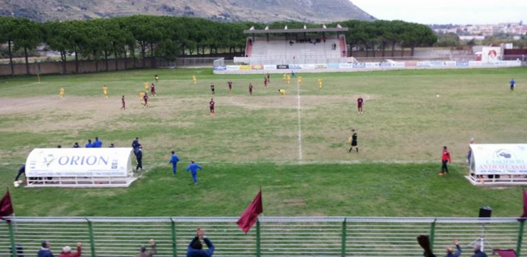 PRIMO TEMPO. Le forti raffiche di vento condizionano le manovre di gioco per entrambe le compagini. Costruire occasioni da rete diventa molto complicato, ed infatti i due portieri per il primo quarto d’ora sono completamente inoperosi. Per sbloccare una partita del genere serve un episodio e questo è ciò che succede al 19’, con il Mondragone che si porta in vantaggio, approfittando delle folate a favore. In un’azione confusionaria sulla trequarti, il passaggio innocuo di Improta prende una traiettoria strana per mezzo del vento, scavalca la retroguardia e diventa utile per l’accorrente Arciello. L’under classe ’98 vede Merola fuori dai pali e lo beffa con un pallonetto di testa, facendo esplodere il pubblico presente sulla tribuna locale del “Conte”. Subito il goal, i giallorossi di Domenico Santonastaso proseguono nel macinare gioco ma non riescono a costruire azioni limpide. Per il regista Minauda partono tutte le azioni casagiovesi, ma la difesa locale reprime sul nascere ogni tentativo. Come avvenuto per la rete domiziana, il pareggio rischia di essere siglato per caso. Dall’out di sinistra, il traversone di Perretta si tramuta in un tiro-cross e sfiora il secondo palo, mettendo i brividi al portiere Speranza (28’). Nel finale della prima frazione, gli ospiti insistono con l’intento di pervenire al pareggio. Alla prima da titolare il promettente Ostrifate fa vedere buoni sprazzi di gioco, anche se troppo spesso s’intestardisce con la sfera al piede. Dalla tribuna l’allenatore squalificato Nicola Coppola ordina di abbassare il baricentro alla compagine locale che rientra negli spogliatoi sul punteggio di 1-0.