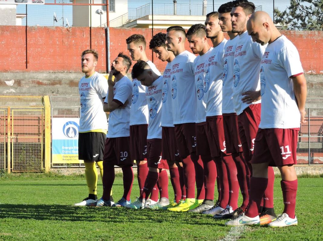 POMIGLIANO D’ARCO. Le due squadre scendono come annunciato alla vigilia con una t shirt dal messaggio ben preciso:NO ALLA SLA, PEPPE NON MOLLARE! Al centro del campo il direttore sportivo granata Salvatore Violante ed il vice presidente Felice Pipola consegnano una targa ricordo e la maglia del Pomigliano a Filly e Raffaele Panico. Il pensiero di tutti va al fratello Peppe per non abbassare mai la guardia, per incoraggiare sempre chi sta conducendo una battaglia grande.