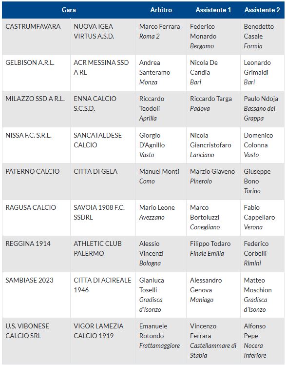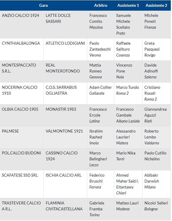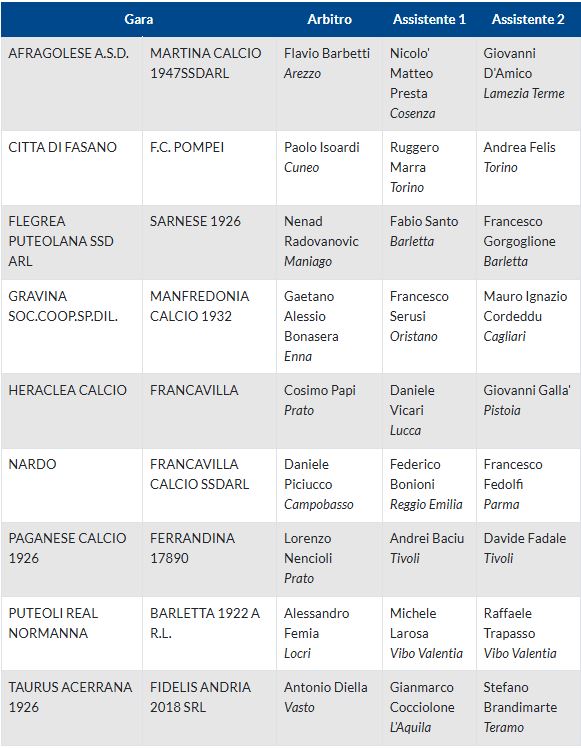 Alle 14.00 prende il via Nocerina-Sarrabus Ogliastra (G); alle 15.00 Fasano-Pompei, Gravina-Manfredonia, Heraclea-Francavilla, Paganese-Ferrandina, Real Normanna-Barletta, Acerrana-Fidelis Andria (H), Milazzo-Enna, Nissa-Sancataldese e Sambiase-Acireale (I). Alle 16.00 Nardò-Virtus Francavilla(H).