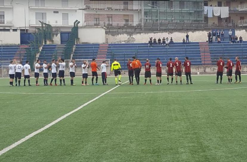 Avvio rocambolesco e ricco di spunti. Poco dopo il quarto d’ora di gioco sono i mariani a rompere il ghiaccio. Punizione piuttosto dubbia concessa dal direttore di gara, se ne incarica lo specialista Porzio che di potenza buca Speranza, firmando lo 0-1. Va di male in peggio ai vesuviani che di lì a poco perdono Ruggiero, colpito duro da Sorrentino, al suo posto Di Martino inserisce Attianese, uno dei volti nuovi del gruppo, nonostante una condizione atletica non ancora ottimale. Al 22’ ci pensa Prisco a spezzare l’incantesimo: punizione magistrale la sua che non lascia scampo ad Alfieri, primo gol stagionale per i rossoneri che trovano così l’1-1. Il pari però non dura a lungo. Poco dopo la mezz’ora di gioco, i pompeiani rimettono la freccia. Corner calciato da Porzio, topica di Attianese che favorisce l’inserimento di Malafronte che da due passi scrive l’1-2.